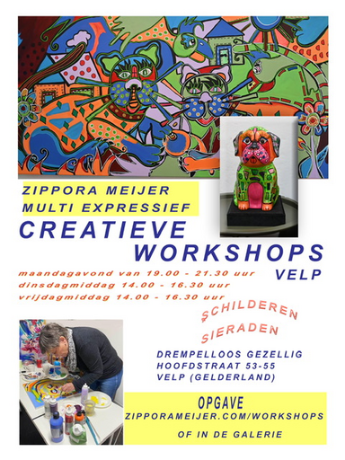 Zippora geeft creatieve workshops in de galerie te Velp.